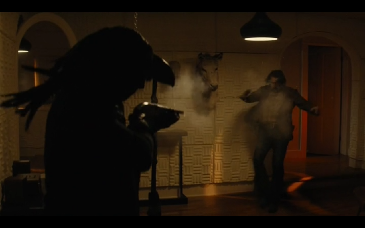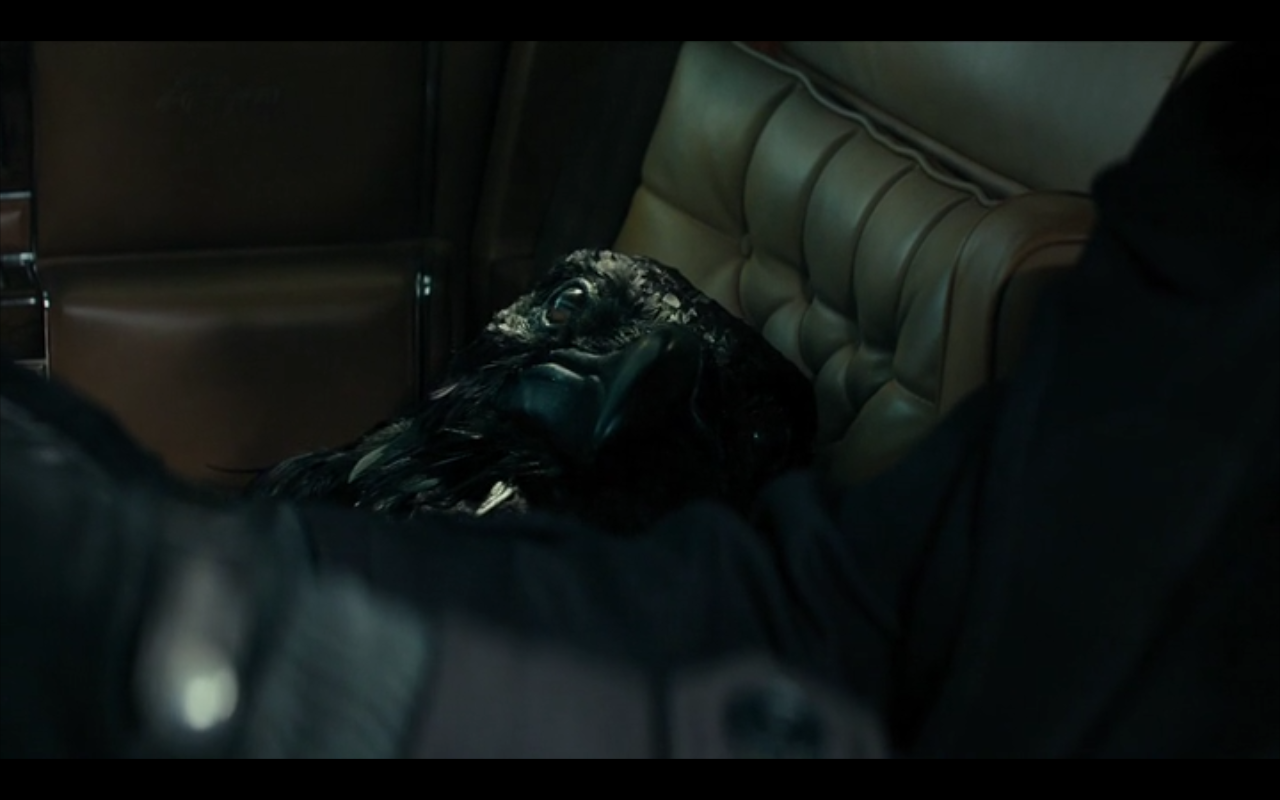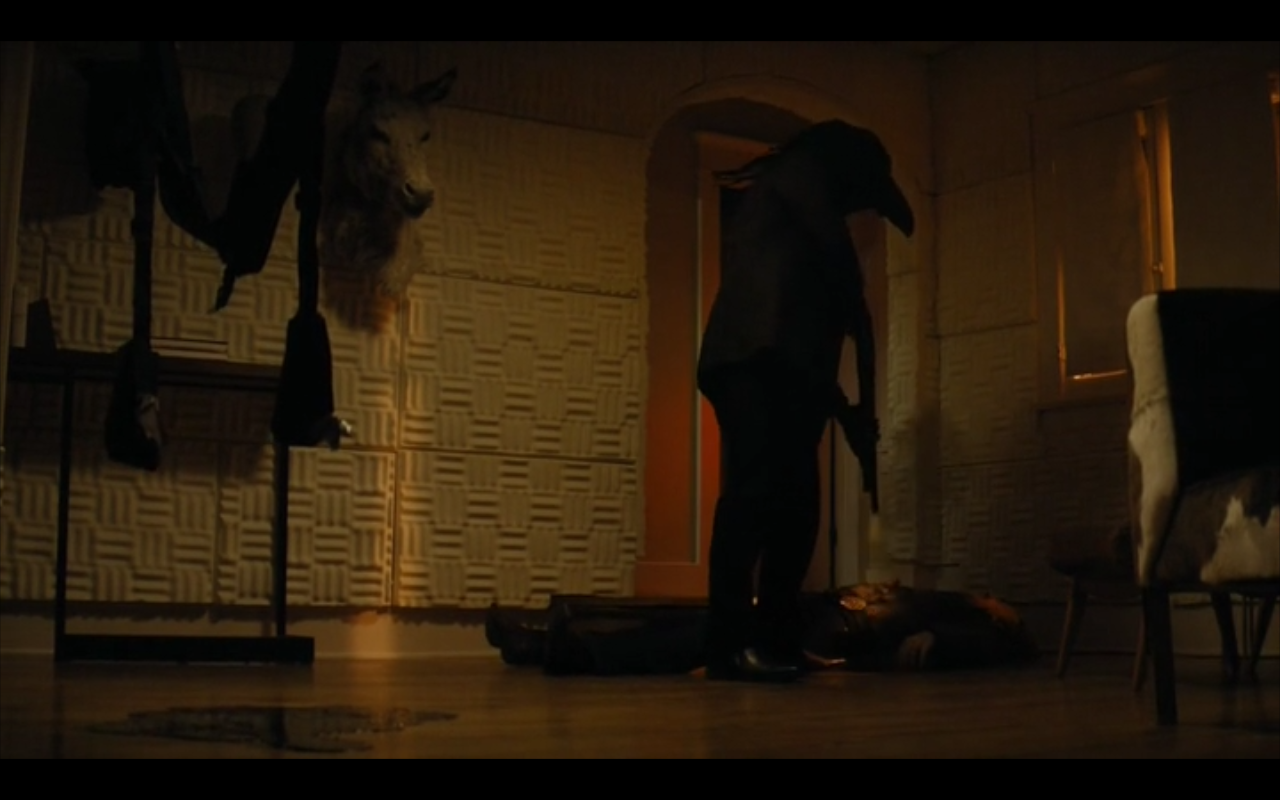 In Episode One, there’s a shot of Ben Caspere’s corpse riding in back of a car, and upfront alongside the driver sits a big crow/raven type of mask.
