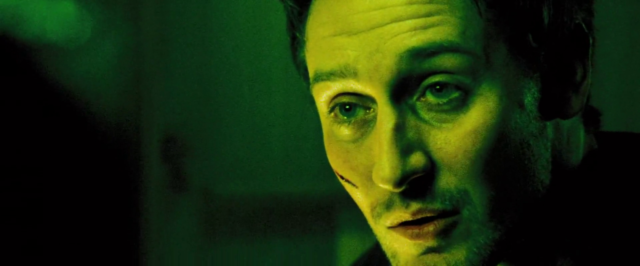 Dunstan uses a great colour scheme that makes it feel like an old school genre picture. There’s this green-ish/yellow v. blue thing going on at times (as you can see in some of the pictures I’ve included), and I liked how it made things look. Not only that, there’s almost a grainy layer over the camera’s lens in a lot, if not all, of the scenes. I like it, Reminds me of the look David Fincher chose to go with for Se7en. Together with the choice of that green/yellow and blue pattern, almost muted and blurry colouring, the grain of the film makes things look dark and gritty. Super fitting for the way things play out.