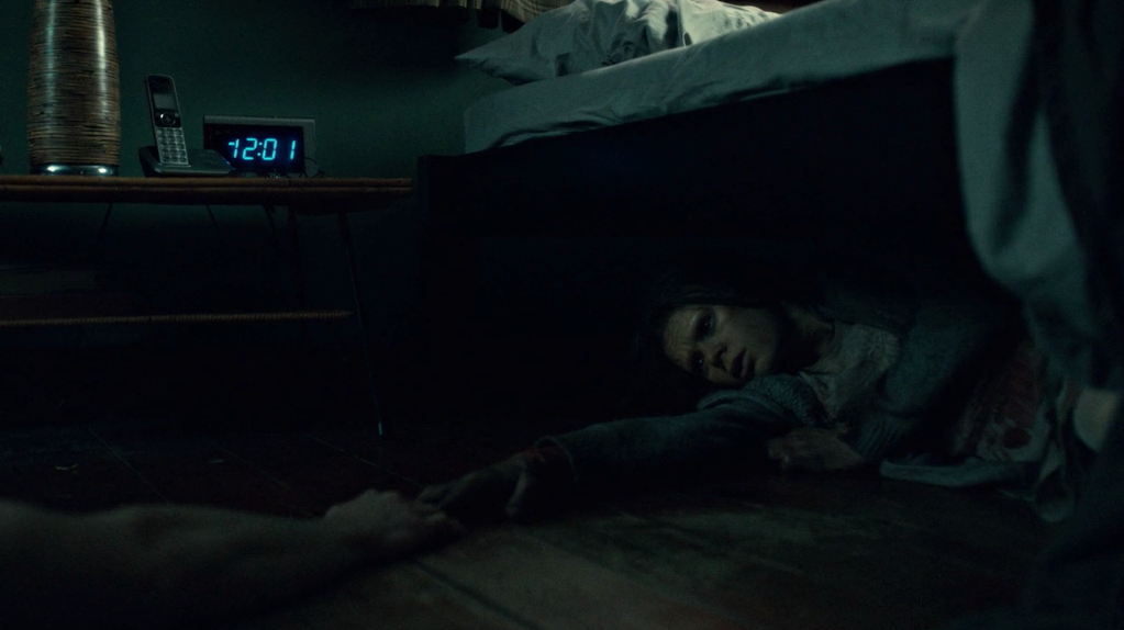 The disturbing part here is when Hannibal requests Will draw a clock on a piece of paper in his notepad. Graham does so; we see it from his point-of-view, and the clock looks perfect, the hands correct and numbers all around in the right places. When passing it back over to Hannibal, we see it from the doctor’s point-of-view now: the hands are completely out of whack, the numbers drawn on one side and all down the inside of the clock’s face, some out.When Will heads into the crime scene this time, we don’t see it. Because even Will himself doesn’t remember it. Will goes from fishing, gutting a fish – or at least that’s what we see: could be another dream of his – to being on top of the victim, looking down, envisioning the blood pumping out of her wounds.