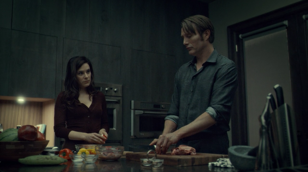 Immediately following this quote, we see the face of Dr. Alana Bloom (Caroline Dhavernas) in a close-up. She’s watching the naughty doctor, scarred from his encounter with the killer Graham sent after him in “Mukozuke”, cut up a heart, preparing some more of that succulent cuisine for cooking.