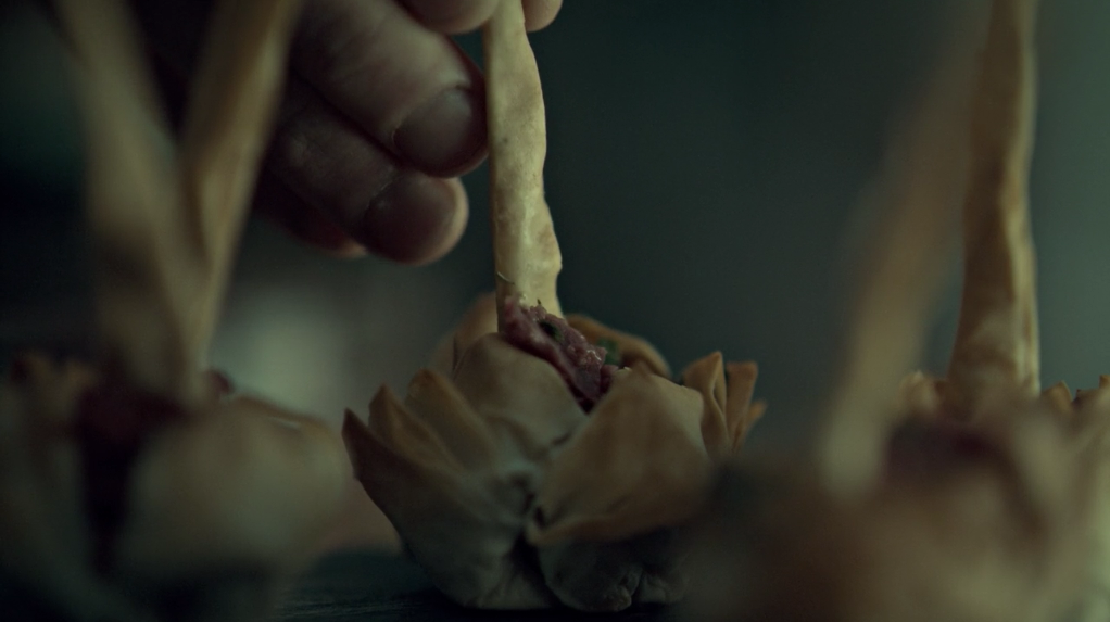 Another of my favourite moments in “Futamono” is when Jack Crawford first arrives at Hannibal Lecter’s dinner party. He stands around for a moment, surveying the crowd. The music gets woozy, the visuals slow down. Jack watches several people – Alana Bloom included – ingest the food, and you know what he’s thinking: the same as us, they’re eating people.
