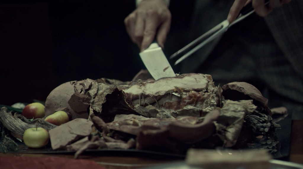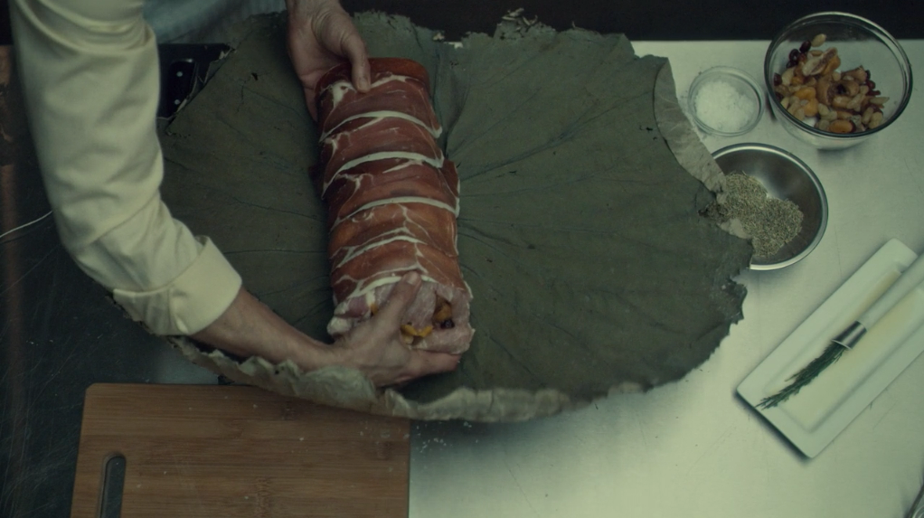 We get more amazing culinary artistry from Janice Poon, the handler of Hannibal foods. Here, we watch Hannibal clay-roast a side of meat. Wrapped inside a massive leaf under the clay, Hannibal slices off some pieces. Abel Gideon, with a nice I.V bag attached to him, sitting at the table and missing a leg, watches as his host carves the roast. Amazingly disturbing scene.