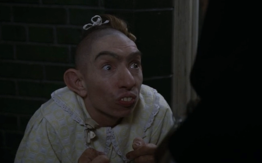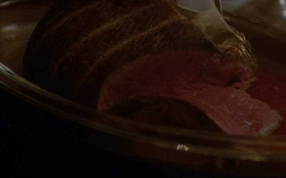 Dr. Arthur Arden (James Cromwell) has a nice dinner planned at home. Not only for himself, but a guest arrives: a young prostitute (Jenny Wade). It’s a chilly scene, as Arthur almost looms over and around her. He’s given her a fake name; she calls him Stan over and over. He clearly has ideas about what a woman ought to be. When the prostitute talks about a “big cock,” he looks utterly repulsed. He starts talking about how unsafe it must be for women on the streets such as herself with Bloody Face about. Though cheekily he says now the culprit is locked up and the girl is safe once more – all the while, he carves up some rare, bloody pot roast with a long, gleaming sharp knife. Ominous the way he handles the knife throughout the scene, especially at this point. Even the poor prostitute reads between the lines; you can just about her the GULP in her throat.