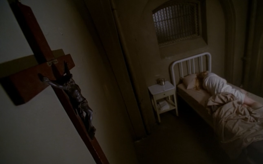 Love how she covers up for Dr. Arden, playing the fool, and then when he leaves she flicks the blankets off her body in an almost disgusted gesture. At the same time, the crucifix on the wall shakes. Dig that moment so hard!
