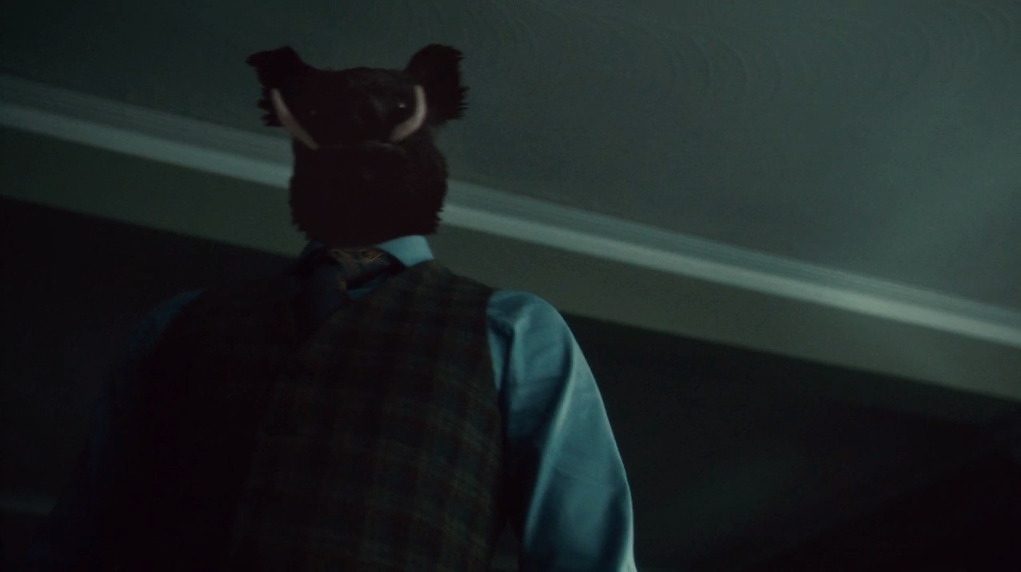 Like that touch – Will wakes up in the aftermath. Blood streaks all over the platform above the pig pen. In with the pigs on the rope where Hannibal had been suspended is half of one of Mason’s henchman.
