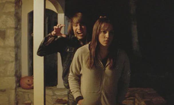 Something I love is how Ti West does these awesome edits with both visuals and sound. First, we get a SCREAM which happens during a transition from the barn out to the car, where and older woman is waiting for her husband to come back; it’s on the radio, but the way West crosses over to that bit is excellent. For a split second I honestly was waiting for someone to come running, or something. Effective, brief moment. Secondly another comes when the old woman wanders into the dark of the barn, then this sound starts to come that you almost feel is coming out of the shadows, yet it cuts to one of the friends standing behind the now broken down car revving, brake lights shining red in his face, and the sound has actually been the car the whole time. These are little simple bits people often don’t think of, however, when they’re used appropriately to put the audience on a tense edge, waiting for something, anything to happen, it’s a killer move. West uses these in a way other horror filmmakers might use jump scares – instead of frightening us, it simply ratchets up the tension and creates an unsettling, edgy mood.