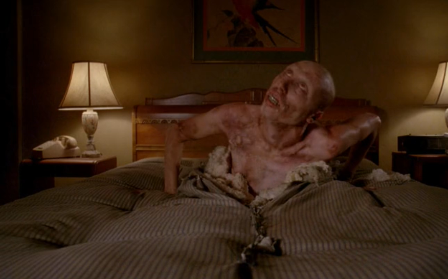 This part actually reminded me a lot of Se7en. Not positive if Murphy and Falchuk intended this as a sort of sly homage to the scene where Morgan Freeman and Brad Pitt find a near dead man strapped to his mattress still alive, even though he looked positively foul. But either way, it was awesomely frightening and definitely takes me back to Fincher’s movie.