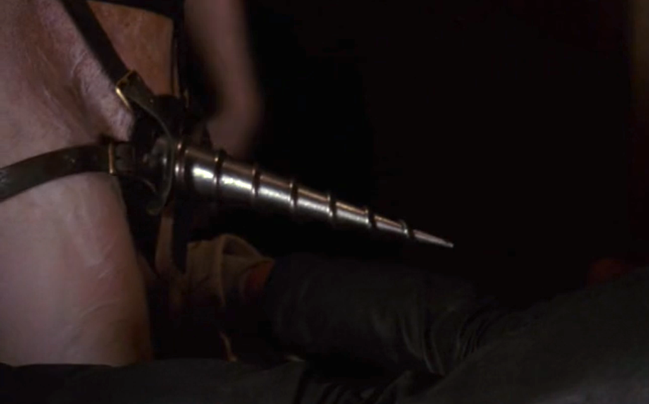 When Gabriel makes it back to his room, yes, yes, he shoots up a bit of junk. Then the visions begin – the maid from earlier who’d been steaming out blood, but even worse is an ugly, deformed demon-like creature who comes out of the darkness, bends Gabriel over, and brandishes a STEEL DRILLBIT DILDO! Yowzahs.