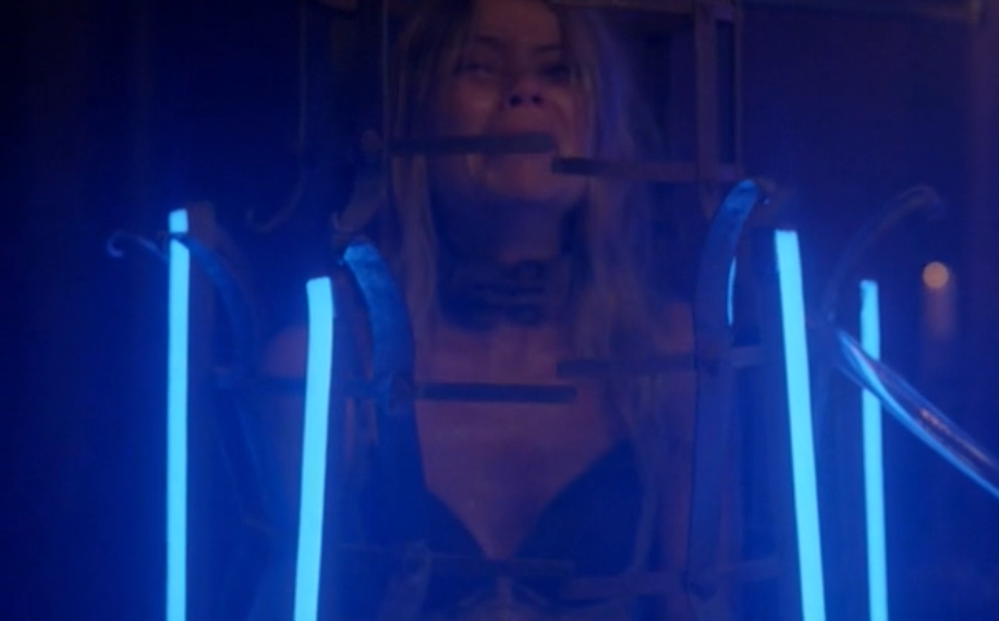The two tourists from our opener are now caged into some strange steel traps lit with neon lights. They’re terrified, of course. Iris has a good tray full of a bunch of different meats, oysters, alcohol, et cetera. She’s decided to help flush their systems out, having gone through their luggage and discovering they are fairly drugged up party girls. But this force-feeding by tube is a bit intense, I would say. Iris loves this sort of stuff, obviously.