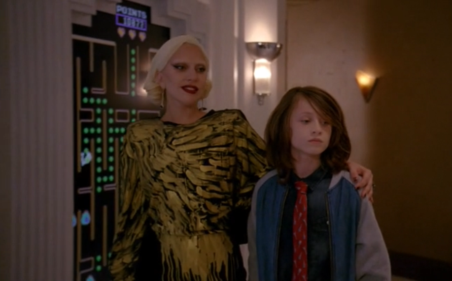 Already from the start we’ve got a ton of creepiness: first one of the maids is trying to steam out a big bloody stain in a sheet down one hallway, then a creepy lone child pointing eerily appears down another. There’s also a dreamy moment where we see a gold, glittery glove with pointy nails reaching out for one of the tourists, as she is back on; we see only the glove, no doubt belonging to Lady Gaga’s character who we’ve yet to meet, and no real noise only unsettling music lowly building, then cut to the tourist turning around, nobody there. Spooky!