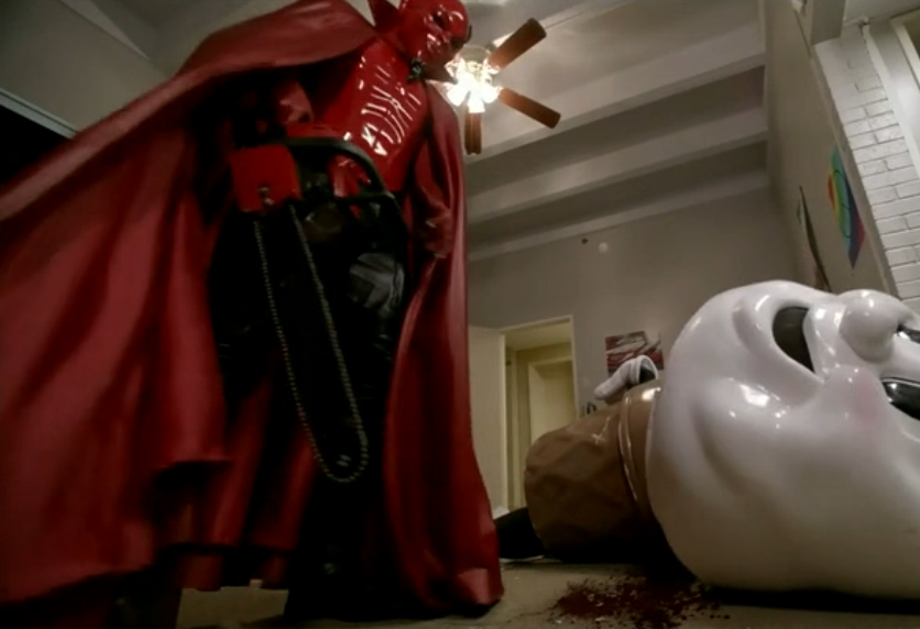 The Red Devil – only one it seems this time – shows up back at Kappa House when Gigi opts to leave her and Dean Munsch’s room to sleep on the couch. Wes gets a chainsaw to the arm trying to defend Gigi (is he the other Red Devil? Key horror trope would be to have him injured, y’know… so it looks more convincing). Even more than that, Wes grabs the chainsaw, after the Red Devil disappears into thin air, and tells Dean Munsch: “You’re the killer”