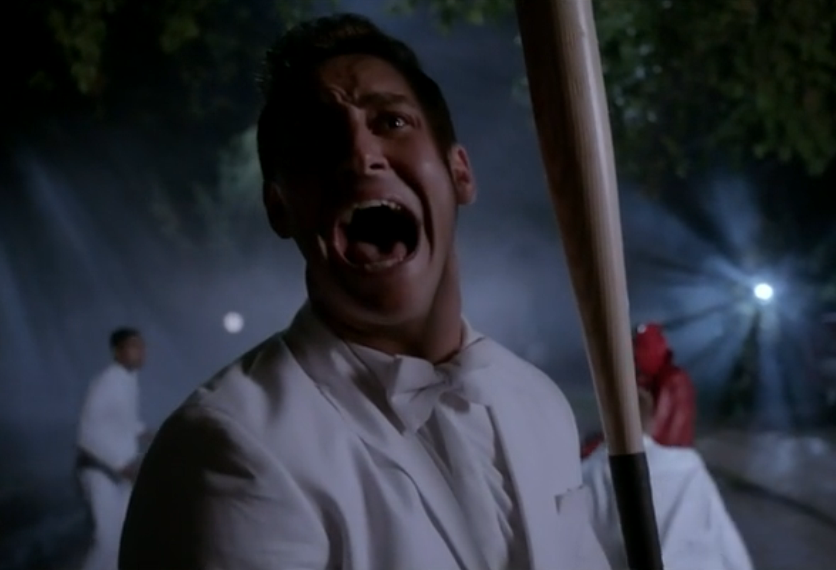 But what I love is the scene set to “Backstreet’s Back” with the fratbros fighting the Red Devil; only there are TWO Red Devils. They come wielding chainsaws. Just as it looks like Chad Radwell is going to get the saw, one of the bros runs in to save him only to have both his arms lopped off, the effects like the wonderful “Tis but a scratch” scene from Monty Python and the Holy Grail. Just a gnarly awesome sequence all around.