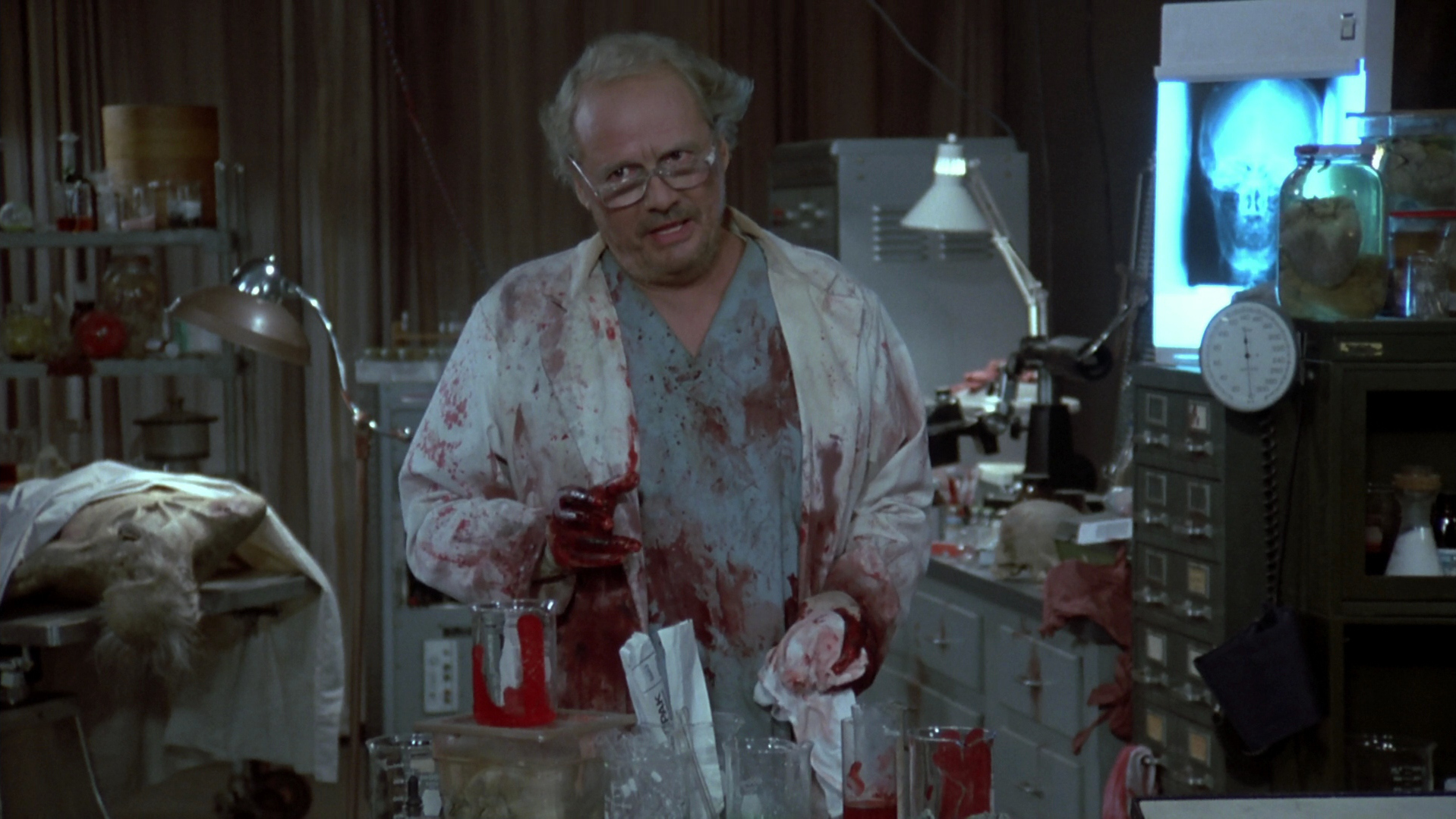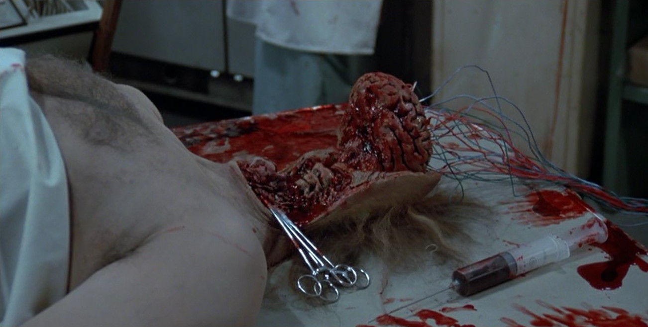 Truly, this film is a haunting zombie horror. In my opinion the special makeup effects are best here. Savini gives us amazing gore to soak up. Greatest of all comes quickly, after we’re introduced to the man lovingly referred to as Dr. Frankenstein by the other scientists and the military men, Dr. Logan: a zombie on one of the operating tables leans over, ripping a strap from its arm, and reaching out its guts and innards fall out of the stomach’s cavity onto the floor, slopping in its own mess. Nasty bit! Even better, the dream imagery comes back – like the beginning scene – except much more brutal, and it emulates the zombie’s guts falling out: as Sarah lies in bed, she imagines seeing Miguel similarly lean over with his insides evacuating, then comes back to reality fast. These alone are worth the price of admission regarding special makeup effects. Savini really pulls out his big guns in this movie, taking away the comic book garishness(/awesomeness) from his Dawn of the Dead zombie work, replacing those qualities with equal excellence on top of dirty, disturbing and realistic blood. Not knocking his previous work for Romero, on the contrary – I love it (check here if you don’t believe me). There’s simply a better, more terrifying aspect to the special makeup effects here; while the cartoon-like essence in Dawn of the Dead came a subtle creepiness, here it’s an outright mortifying feeling Savini gives us. Thank you, Tom!