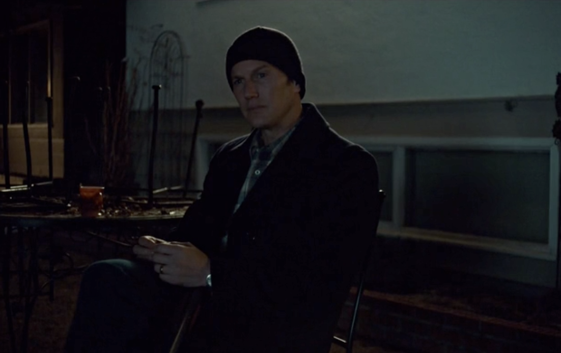 A little later Mr. Dent strolls into the Blomquist garage, alone, quiet. He knows the ways of murder. He rubs the floor, smells it, and then looks up to find bleach on a shelf nearby. There’s an amazing presence Zahn McClarnon displays, as Hanzee walks around the house and examines everything, flicking his Zippo open to have a look here and there, even finding what looks like Rye’s belt buckle in the fireplace among the ashes. Over top of the scene plays “Song of the Earth” played by the Philharmonic Orchestra, a piece by Gustav Mahler.