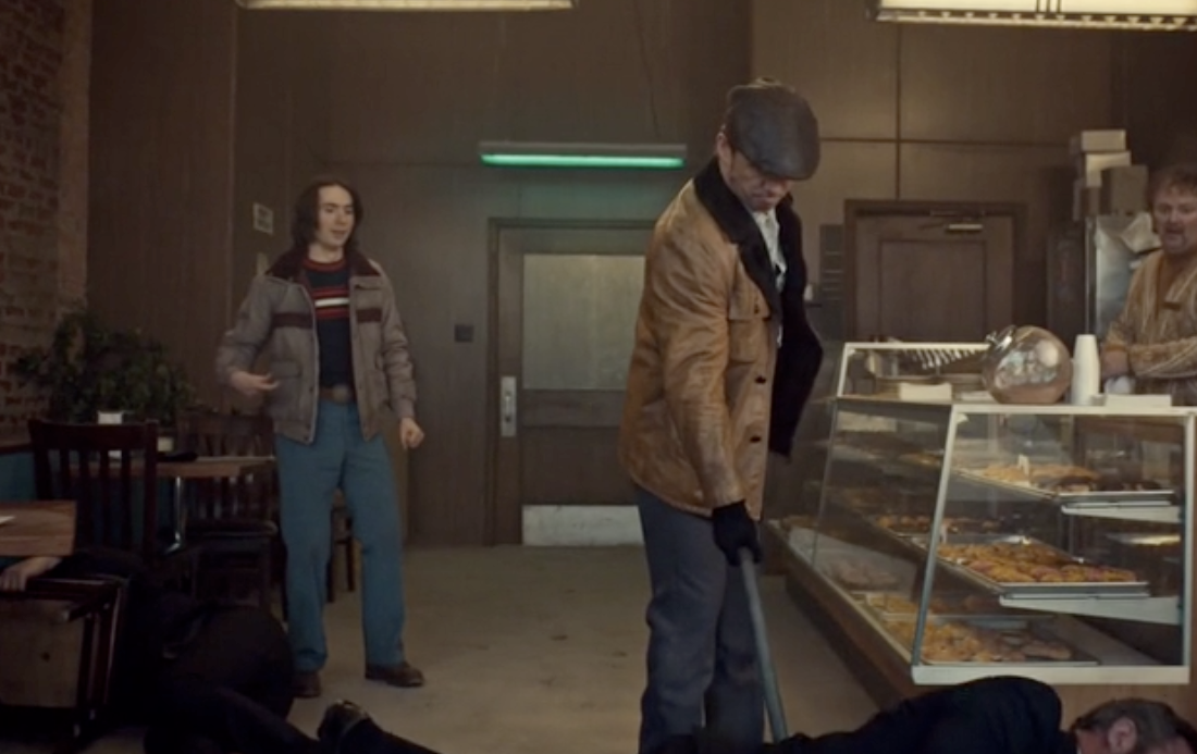 Back in their current timeline, Dodd (Jeffrey Donovan) is teaching his nephew Charlie (Allan Dobrescu) the ways of the Gerhardt clan. They end up at a restaurant where Dodd tasers a man violently, getting Charlie to join in on the action with a few punches. Nice bonding. Surely Bear (Angus Sampson) is going to be REAL happy with his brother showing his son – someone he wanted to be away from the family business – the dirty, gritty ropes. Not just that, we get a bit of Devo’s “Too Much Paranoias” to boot. Jam.
