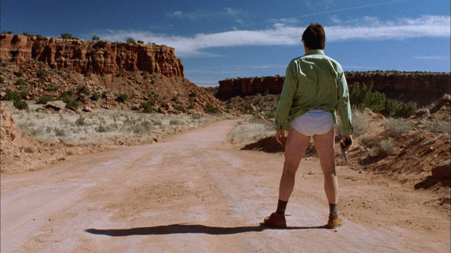 A large Winnebago is barreling down a road out in the desert surrounding New Mexico. Inside there’s a man driving wearing a gas mask and only tighty whitey underwear, in the passenger seat is a passed out man wearing the same (gas mask; not tighty whiteys). After a minor crash, Walter White (Bryan Cranston) runs out and frantically, at the sound of sirens, records a message to his family, tears in his eyes. Then he heads out onto the road confidently, with only a shirt and underwear on, brandishing a gun at the sound nearing him.