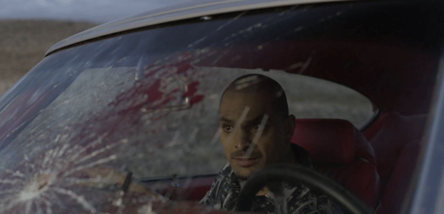We see Victor (Jeremiah Bitsui) drive straight through some spikes in a car, tearing up the wheels and riding on the rims for a little ways before coming to a stop. He’s working to make it look as if there’s been a car accident on the road, along with Tyrus (Ray Campbell), who’s tossing broken glass out the window along the way to the staged accident. And Nacho (Michael Mando) is their driver. They’ve got a body in the car’s trunk, too: Arturo. They shoot the car up after the corpse is in the driver’s seat, pumping the doors and every inch of the frame with lead. They empty several clips into the vehicle.