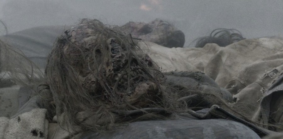 The reason the group’s in this situation is because they’re trying to help someone they met over the radio— Logan (Matt Frewer). The kids in the van aren’t into helping strangers. At least not strangers they didn’t end up with by chance. Morgan tries to explain they’ve been attempting to “make things better out here.” But there’s vast dissonance between what it’s like to be a child and what it’s like to be an adult in the post-zombie apocalypse. The kids try to explain things in this area are especially horrific. They stop at a roped off part of road. It’s actually a bunch of zombies, their guts intertwined in a blockade. Above them are zombie heads decapitated from their corpses, as if they’re hanging apples rotting on the vine.