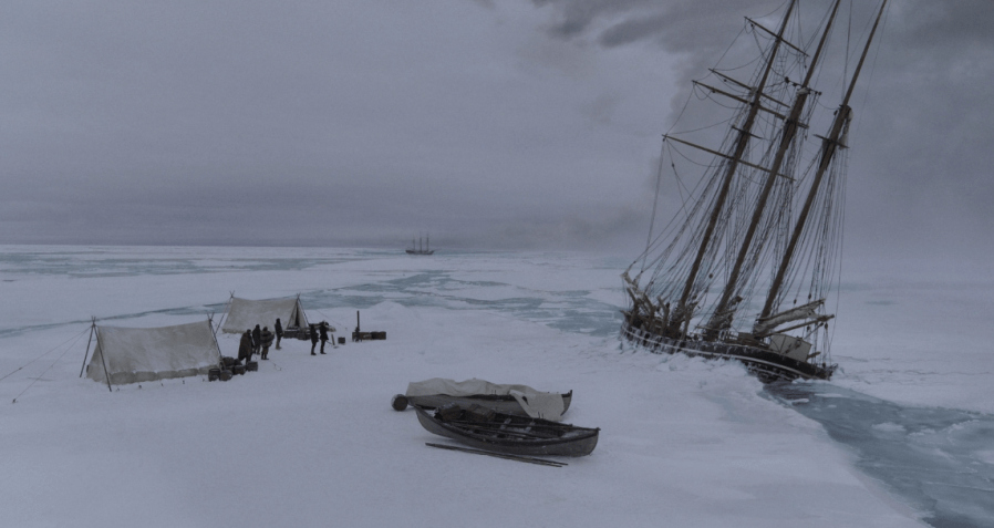 Afterwards, Drax and Cavendish watch the ship start to sink from the ice with some of the crew who’ve yet to head for the Hastings, including Sumner, ordered to stay. They’re all going to wait out the brewing storm, then head for the other ship. One trouble is that Sumner will have no laudanum to keep him going through the night with the medicine chest headed off to the Hastings. He also doesn’t like being around Drax in a tent, having to spend the evening with a man who intended to bludgeon him just as was done to Brownlee. We hear a rambling nihilistic rant by Drax. He keeps attempting to intimidate Sumner, but the surgeon doesn’t engage much.