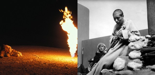 Effectively, Dreyer and Scorsese take us through the concept of sainthood. Those accepted to this higher calling must go through torture, both mentally and then physically, followed by death to transcend their humanity into full divinity. While Jesus is clearly higher than a saint, the trials through which he goes are no different than those of Joan; he is, by all definitions of the word, a martyr. The most significant difference is Jesus must prove to himself that he wants to be divine and is given superior knowledge from God, which is why his death is less brutal on film. Joan has to die for her beliefs, to prove to others the depth of her faith, and all without any foresight into what lies beyond death. This is the chief reason Joan’s journey culminates in a genuinely horrific act of violence perpetrated against her. Even her burning compared to the depiction of Jesus’ crucifixion is visually more disturbing.