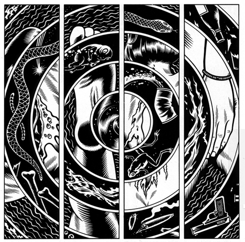 While the first lower panel simply depicts the frog Keith was dissecting before hallucinating, it also represents the struggles of adolescence. Particularly in the 1970s, and most likely up until about the mid-1990s, many high school students were able to bond over typical activities any high school age adolescent might go through. One such activity being the dissection of frogs for biology. Burns uses the image of the dissected frog as a symbol representative of the eternal nature of the struggle with adolescence. The cut open frog represents a collective experience. Burns then uses the image of the dissection and carries it through each of the others after the first, as the same incision type opening appears in the next two images.