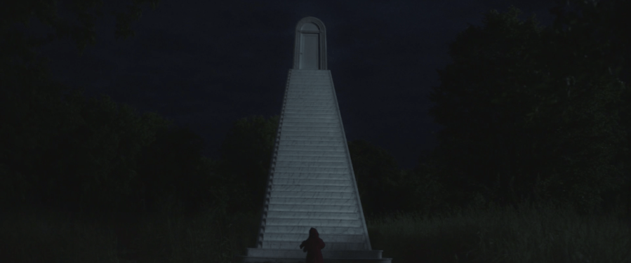 Alice goes beyond the door at the top of the stairs, where she finds more madness.